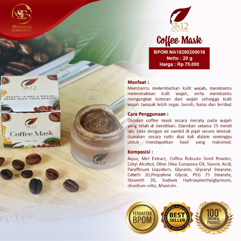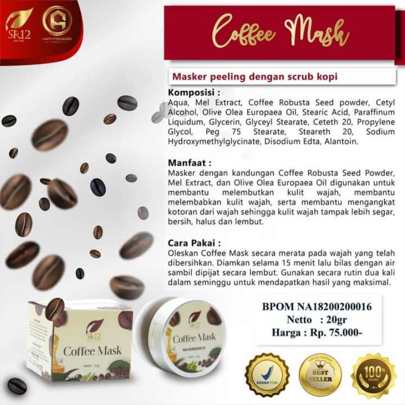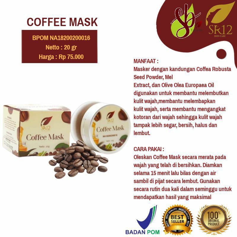 Manfaat Masker Kopi Sr12 Tidak hanya untuk melembutkan menyamarkan noda serta mengatasi jerawat produk masker kopi memiliki manfaat yang lainnya sebagai berikut. Cara Pakai Masker Kopi Sr12 Cuci muka biarkan basah oleskan coffee mask merata keseluruh wajah. Basahi wajah dengan air hangat Oleskan coffee mask merata ke.
